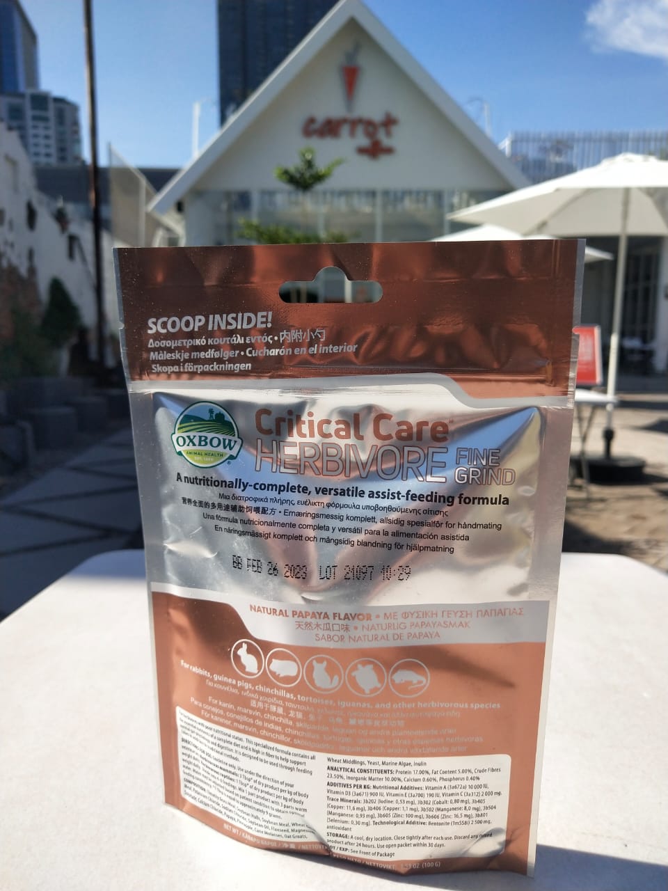 Nutrisi lengkap, serbaguna untuk pendamping makanan, berbentuk serbuk halus. Critical Care Herbivore Fine Grind Natural Papaya Flavor, merk Oxbow. Produk USA. Asli, tanpa campuran, kemasan segel isi 100gr sudah ada sendok di dalam kemasan. Untuk kelinci, guinea pigs, chincilla, kura-kura, iguana, dan spesies herbivora lainnya.